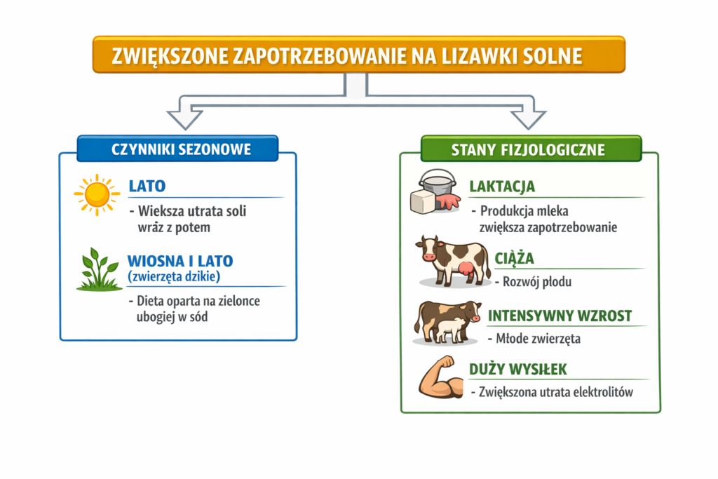 Należą do nich przede wszystkim miesiące letnie, kiedy zwierzęta tracą więcej soli wraz z potem. Zwiększone zapotrzebowanie występuje także w okresie laktacji, intensywnego wzrostu młodych zwierząt, ciąży oraz podczas zwiększonego wysiłku fizycznego. W przypadku zwierząt dzikich zapotrzebowanie na sól wzrasta wiosną i latem, gdy ich dieta oparta jest głównie na zielonce ubogiej w sód.